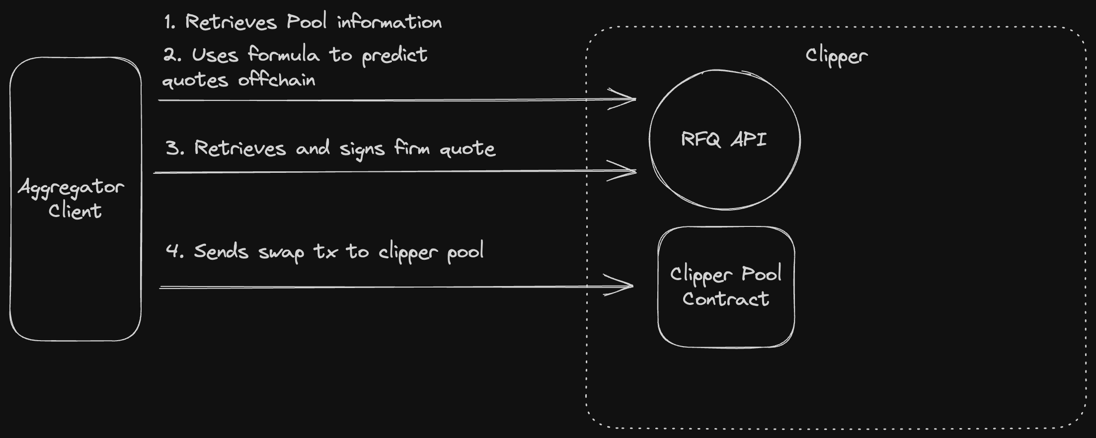Clipper has a hybrid onchain/offchain infrastructure. We expose an API to you with price feeds and a k-parameter, and give you the formula that we use to quote prices based on those + onchain data. That way you can route based on predictions of what Clipper will quote. Once you’re ready to use Clipper in a route you request a quote from our servers. Output scales with input so you can compose in multihop trades.